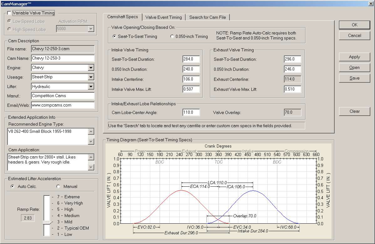 Since the dyno software we use (Dyno Sim 5) is affiliated with Comp Cams, you can purchase a cam disk with all the Comp Cams part numbers available to import directly into the software. It will also let you input cam information directly into the cam manager section if you have all the needed data. We use a lot of Comp’s cams, as well as some custom ground cams for racing applications, so you are not restricted to using a Comp Cams part number (but it is easier). We have selected a couple different cams to see what the power curve looks like. Like we did with the cylinder head selection, the software allows you to compare different parts by overlaying the curves.